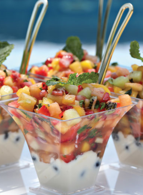 Freshly diced tropical fruits served in vibrant cups, a refreshing mix of fruits. Perfectly portioned for a healthy snack on the go or a guilt-free treat any time of the day.